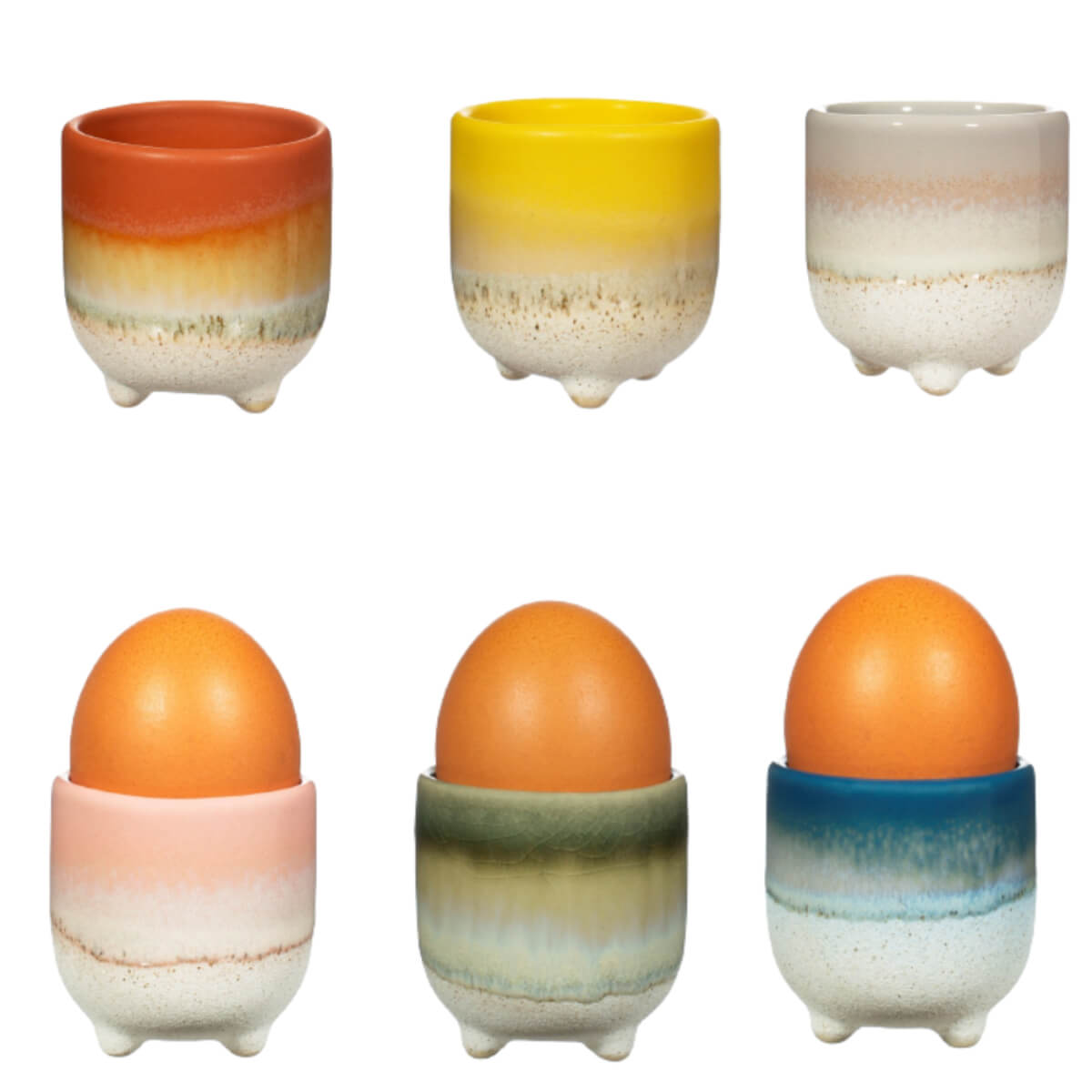 Bring a mellow mood to the kitchen, breakfast bar or dinner table with this delightful little egg cups. Fall in love with the boho style and tonal colourway. The rustic texture and dip ombre effect are created from the reactive glaze which forms subtle variations in colour tones, making each one beautifully unique. Completed with a gloss finish.